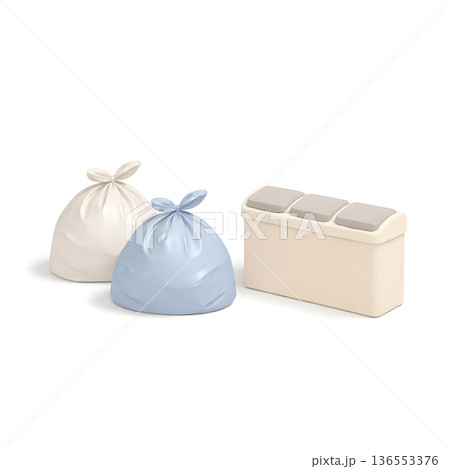 整理收納套裝,垃圾袋和分類盒,3D插圖,正方形,鳥瞰圖,白色背景,邊距