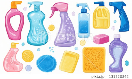 Colorful Cleaning Supplies Bottles Sponges Soap Bubbles Bright Cleaning Products home wash pink blue