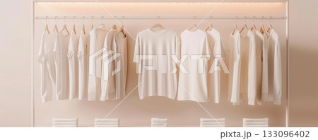 Minimalist clothing display featuring a range of white garments on hangers, ideal for fashion and retail inspiration.