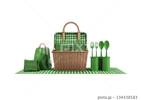 A green picnic set featuring a wicker basket, checkered cloth, and utensils arranged neatly for outdoor dining.