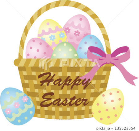 復活節彩蛋 - 籃子裡五彩繽紛的彩蛋和“復活節快樂”標誌的插圖