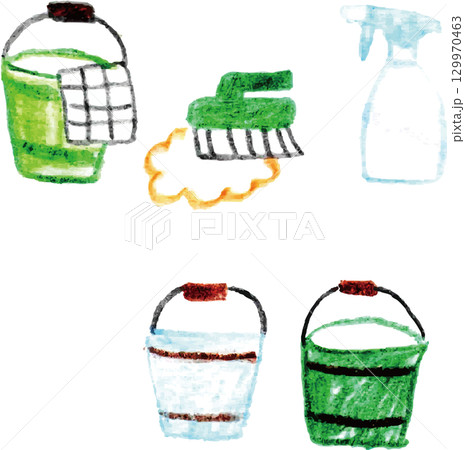 用色鉛筆繪製的清潔工具:桶子、噴霧器、刷子