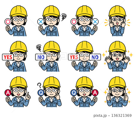 一組插圖,描繪了一位戴著頭盔的中年女工頭。