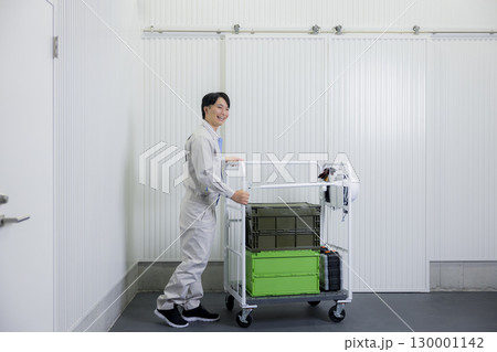 一名身穿工作服的男子在倉庫裡推著手推車