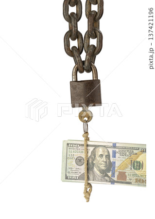 Symbolic Image of Financial Security Displaying a Bundle of US Dollar Bills Restrained by a Heavy Rusted Metal Chain and Secured with an Old Padlock isolated on white