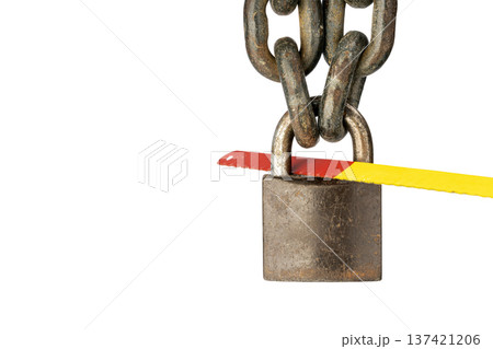 Close-Up of a Rusty Metal locked Padlock with Thick Chain and a Vibrant Yellow-Red Hacksaw Blade Attempting to Cut Through It isolated on white