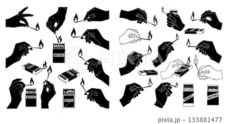 Silhouette hands holding lit matches and matchboxes illustration set