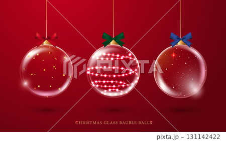 Christmas glass bauble balls, realistic on red background. glass globe stands for Christmas and New Year winter holiday, crystal baubles decoration with snow snowflakes. vector design.