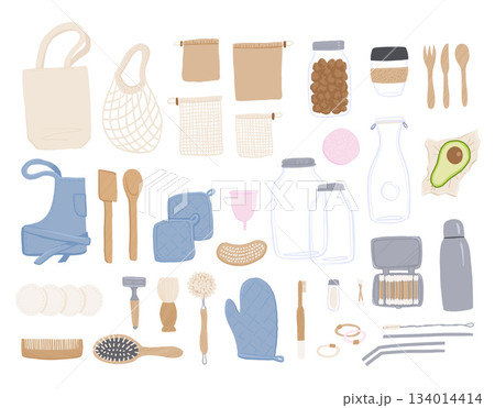 Zero waste set of objects. Kit of flat style eco brushes, cotton swabs, hair pick, safety razor, solid shampoo bar. Reusable kitchenware made of natural biodegradable materials. For eco shop, store