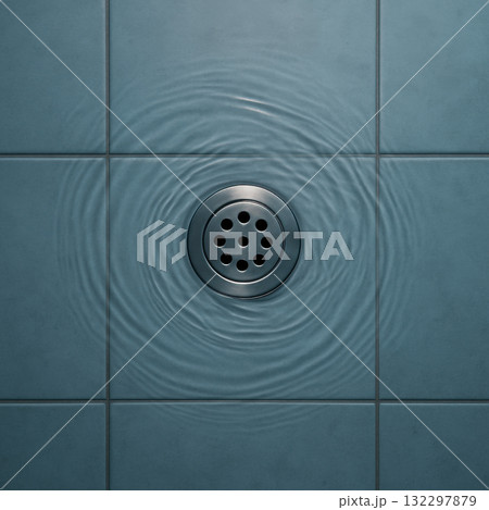 Calm overhead shot of clear water slowly circling floor drain on cool tone bathroom tile floor. minimalistic scene with subtle ripples creates serene and quiet mood