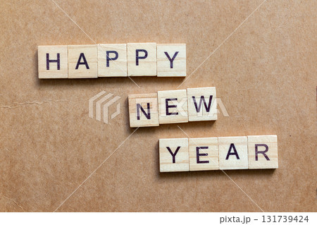 Wooden letter tiles arranged to spell HAPPY NEW YEAR on a brown textured background