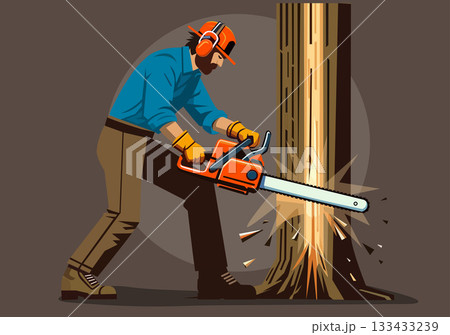Illustration Lumberjack Cutting Tree with Chainsaw