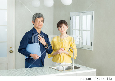 一名工人和一名家庭主婦檢查管道問題