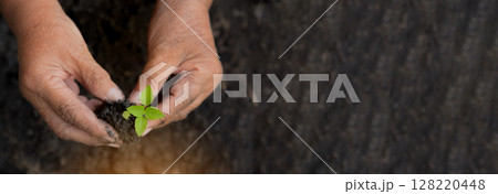 Banner Eco green sustainable hands holding tree earth day environment concept. Hands growing tree on earth day background. Save world energy protect plant tree watering soil garden with copy space