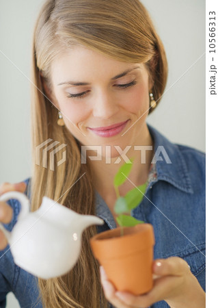 Young woman watering small plant