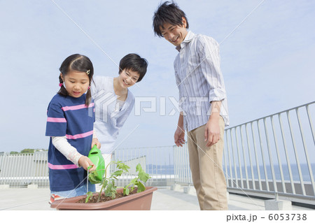 三個父母給播種機的植物餵水