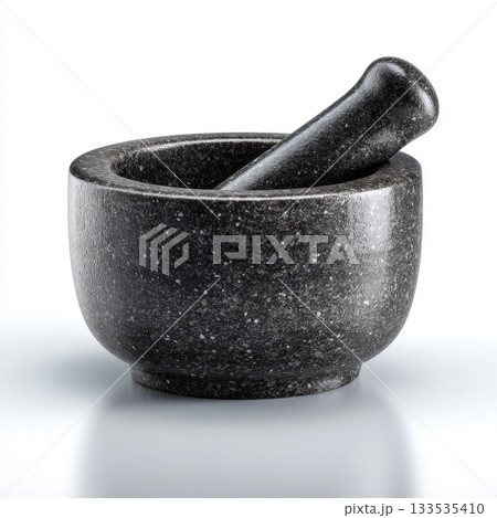 Dark speckled granite mortar and pestle set against a clean white background