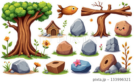 Whimsical tree cartoon rock cute stone wooden hut fantasy forest playful fish floral detail nature scene cheerful mood bright color