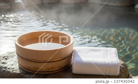 Japanese wooden bathing bowl oke with white towel beside traditional hot spring onsen water natural stone edge