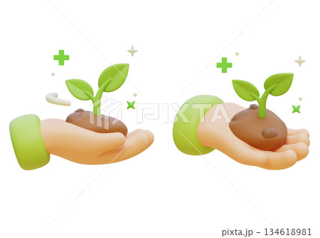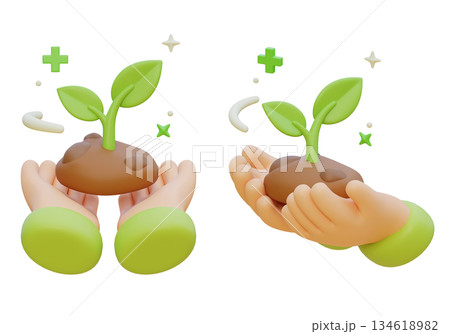 3D Claymorphism Hand Holding Soil with Growing Green Sprout