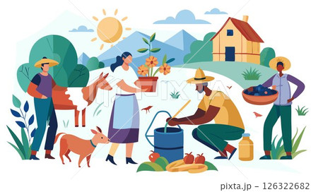 A charming illustration of two farmers, one holding a plant and another with a basket