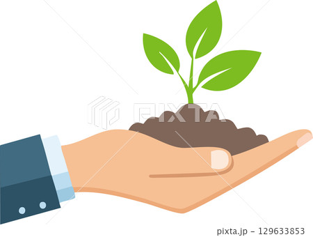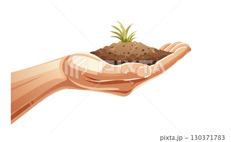 Non realistic illustration of hand offering soil and sprout, clean composition with white background