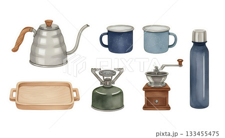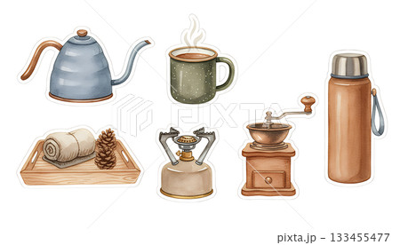 露營咖啡套裝和戶外必需品插圖