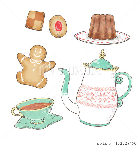 水彩茶壺、翠綠茶杯和聖誕糖果套裝
