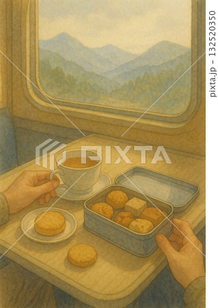 列車旅途的下午茶 鐵道窗邊餅乾與紅茶的水彩插畫
