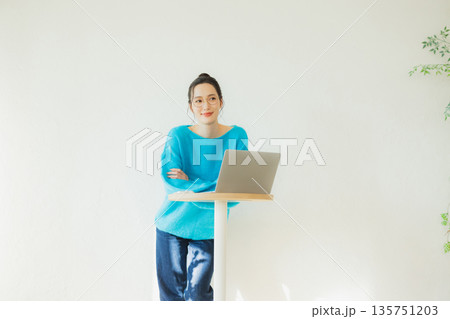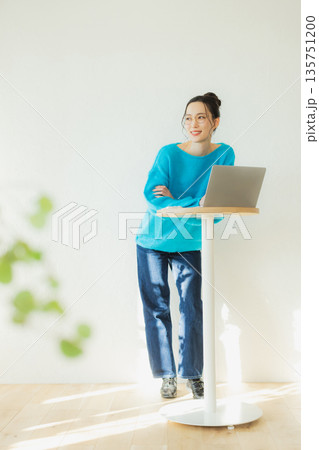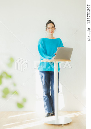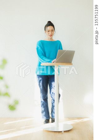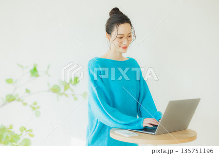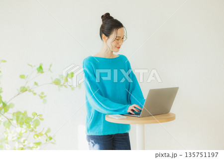 一位短髮女子身穿針織衫,在房間裡輕點智慧型手機。一道柔和明亮的春、秋、冬三季景象。