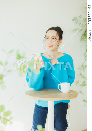 年輕的亞洲女性在窗邊喝熱飲、茶、咖啡