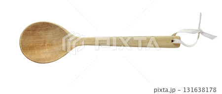 Top view wooden ladle with cloth string for hanging cooking equipment isolated on white background