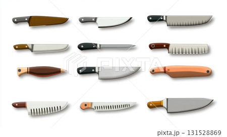 Collection of various kitchen utensils including knives cleavers and a spatula on a white background