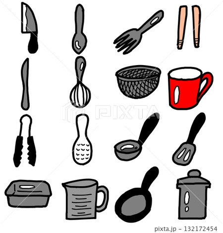Kitchenware hand drawn doodle collection, Kitchen utensils and cooking tools illustrated in a simple style.