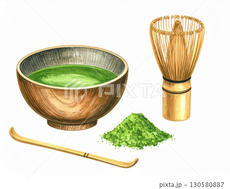 Matcha Tea Ceremony: Watercolor Illustration of Bowl Whisk and Powder