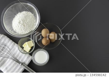 烘焙原料:麵粉、雞蛋、奶油、牛奶和打蛋器,俯視圖,邊距