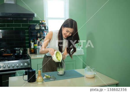 Smiling woman adding fresh matcha to glass of milk and ice for iced latte