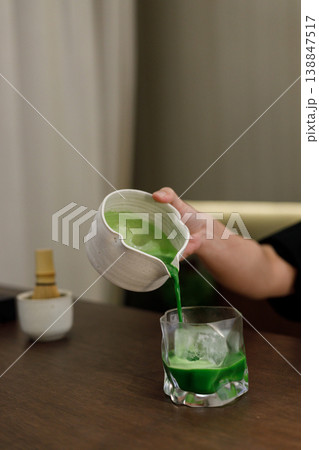 fresh matcha tea, green tea pouring on a glass on wooden table.