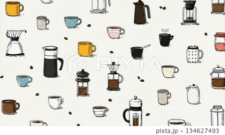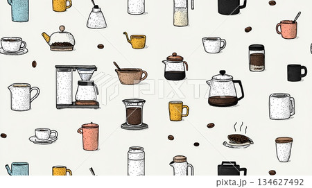French press and cup of tea or coffee. Oil pastel drawn seamless pattern. For interior designs, retro vintage settings, restaurant cafe menu stickers, greeting cards and banners clip arts.