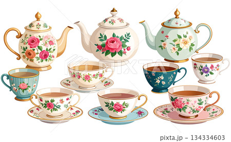 Elegant tea time illustration showcasing a teapot pouring refreshing beverage into delicate cup