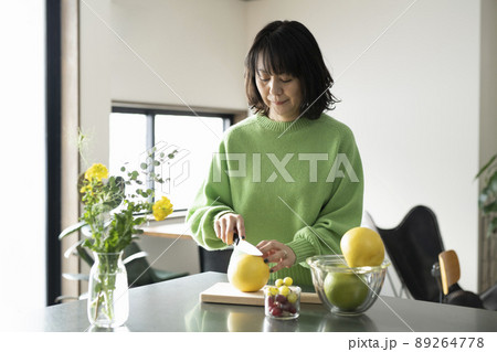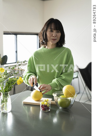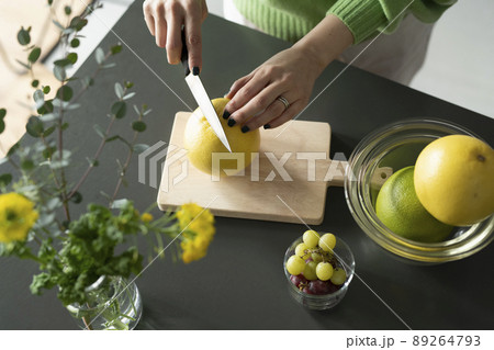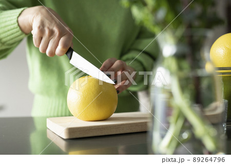 切葡萄柚的婦女