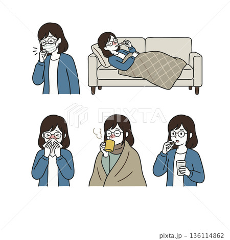 一組描繪年輕女子從感冒或疾病中恢復的插圖