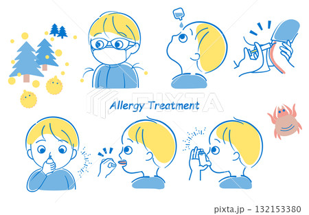 一組患有花粉症症狀和相關措施的兒童插圖_男孩