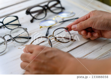 特寫鏡頭:雙手挑選各種類型的眼鏡