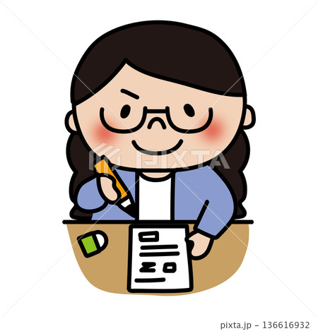 一個綁著辮子、戴著眼鏡的女孩正在考試