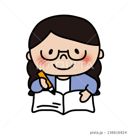 一個綁著辮子、戴著眼鏡的女孩正在學習