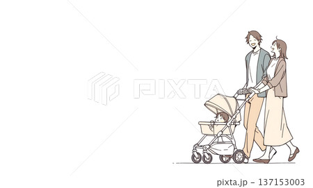 一對年輕夫婦推著嬰兒車散步