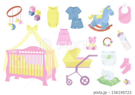 Baby shower and newborn isolated elements set. Bundle of kid clothes and toys, stroller, bath, dummy, bottle, rattle, baby mobile and other. Creator kit for vector illustration in flat cartoon design