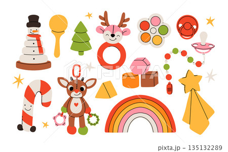 Set of christmas presents for a newborn baby or a toddler. Flat cartoon vector collection of winter toys and baby supplies, snowman pyramid, plush deer, cubes and pacifier.