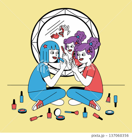 Girls Doing Makeup in Front of Mirror